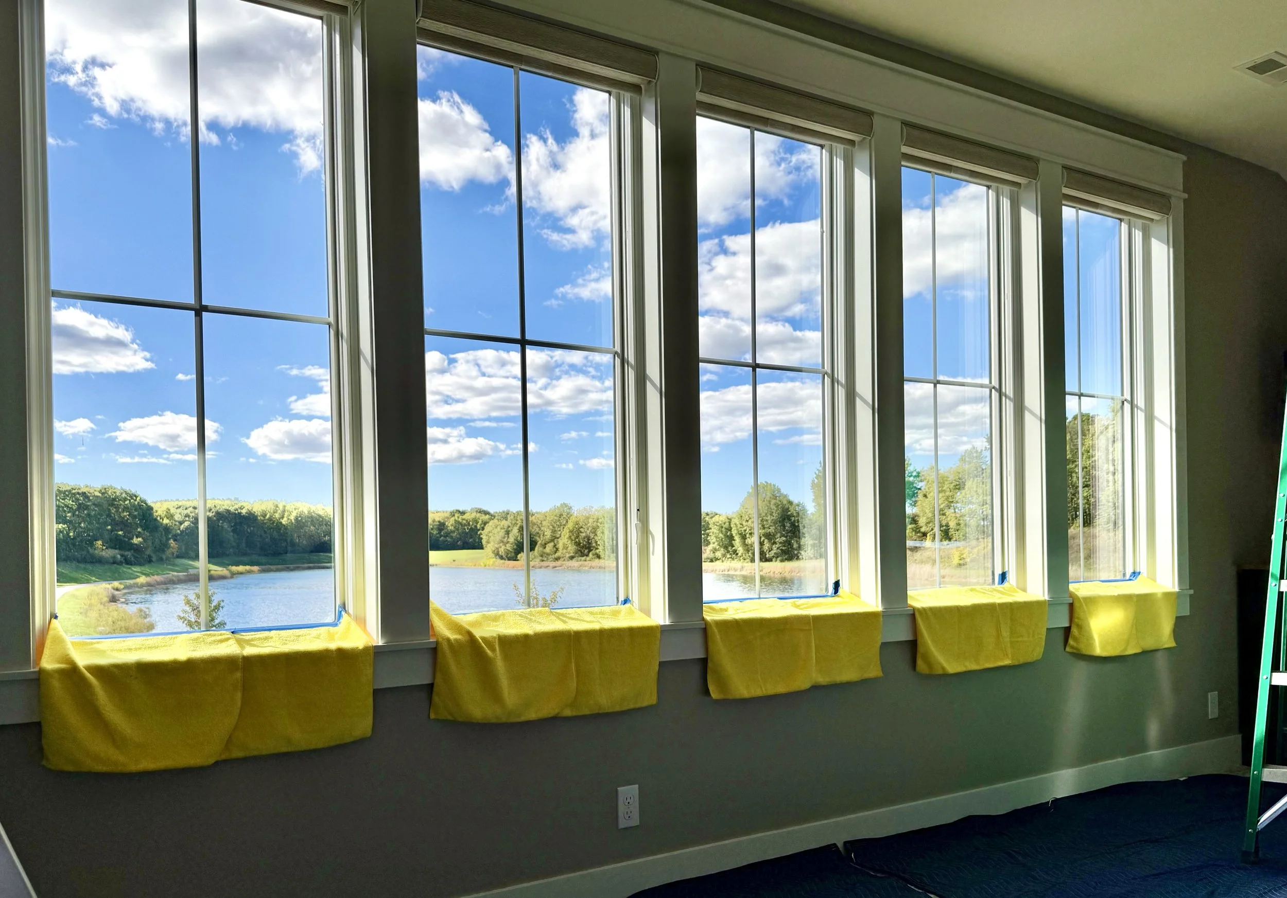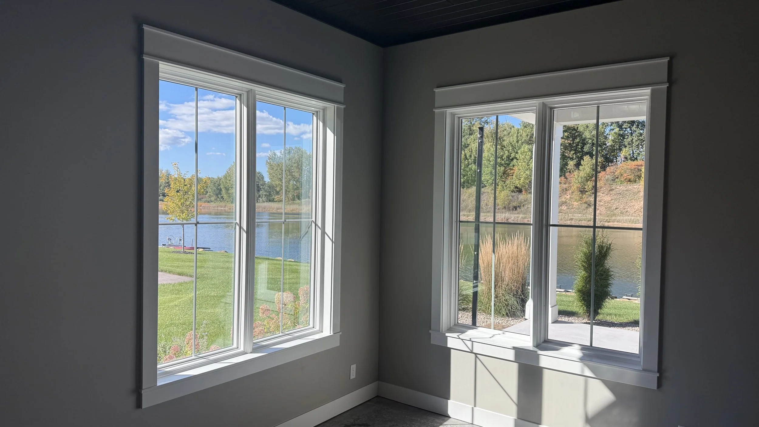 Residential: whole-home installs, sun rooms, living rooms, lakefront windows, sliders, bedrooms, large picture windows.